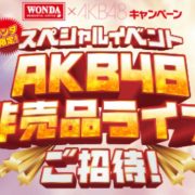 【ワンダ限定】今年もWONDAによるスペシャルイベントが開催!日本のトップアイドルに君臨する『AKB48』彼女たちの圧巻のパフォーマンスが見られる非売品ライブに抽選で最大8000名様をご招待!AKB48と言えば、ぱちんこAKB48ワン・ツー・スリー!フェスティバルで大きな話題を振りまいたばかり!パチンコ 初心者でもすぐに遊べる最新機種と最大3回転のチャレンジ演出!その勝率の高さが評判を呼び、多くのAKBファンがパチンコをオンラインでもプレーするように!AKBの楽曲が次々と流れるパチンコでのコラボーレーションを大成功させた、彼女たちの次のコラボは、香り高いコーヒーで人気のWANDA。キャンペーン対象となる9種のワンダコーヒを飲んで、シールを集めて非売品ライブチケットを手に入れよう!この非売品ライブチケットを手にするチャンスは11回、毎週抽選で応募受付期間は11日間となります。外れてもWチャンスに自動でエントリーできる!WチャンスではWONDA×AKB48オリジナルQUOカード500円分が30000名様に当たる!
